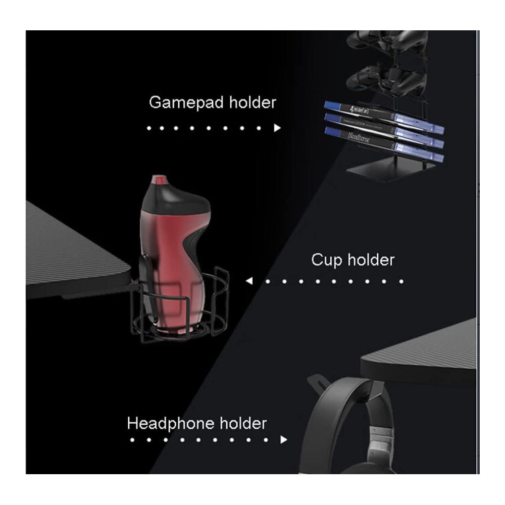 Der R-förmige Schreibtisch ist mit zwei Kabeldurchführungen, Getränkehalter, Kopfhörerhaken, Gaming-Griffhalter und einem extragroßen Mauspad ausgestattet. Diese professionellen Features sorgen für Ordnung und verbessern Ihr Spielerlebnis. Die robusten Beine und der Gussstahlrahmen können bis zu 150 kg tragen, gewährleisten Stabilität und Langlebigkeit.