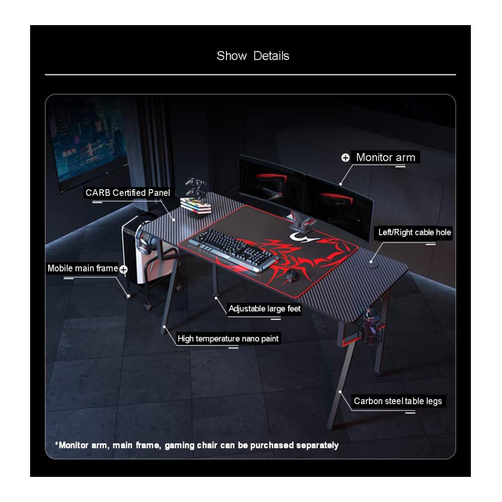 Dieser Computertisch ist ideal für Ihren Arbeitsplatz, Unterhaltungsraum, Musikzimmer, Zimmerecke, Medienraum als Gaming-Schreibtisch, Studiertisch, Schreibtisch, Computertisch, Musik-Keyboard-Schreibtisch usw.Der extra große Desktop bietet mehr Platz für Ihre Gaming-Monitore, Gaming-Tastatur, Mausbewegung und andere Gaming-Ausrüstung.Eine klare und gut organisierte Installationsanleitung ist hilfreich, auch wenn Sie zum ersten Mal einen Schreibtisch installieren. Oder schauen Sie sich unser Video in der Bilderspalte an.Die Oberfläche des Schreibtisches besteht aus Kohlefaser, wodurch er kratz- und schmutzabweisend ist und sich sehr leicht abwischen lässt.Schreibtisch mit Kohlefaserstruktur, daher rutschfest und bequem, sodass Sie keine zusätzlichen Matten benötigen. Kratzfest und bietet eine bessere Wasser- und Schweißbeständigkeit sowie ein verbessertes Spiel- und Büroerlebnis.★Glatte Oberfläche mit Carbonfaser-Effekt★Kabelmanagement, Getränkehalter/Headset-HakenSpezifikationenFarbe: SchwarzMaterial der Tischplatte: KohlefaserBeinmaterial: Kaltgewalzte StahlrohreTischplattengröße: 120/140/160 x 60 x 75 cmMaximale Tragfähigkeit: 150 kg*Hinweis: Über diesen Link wird nur der Computertisch selbst verkauft, nicht der Computer und andere ausgestellte Geräte!