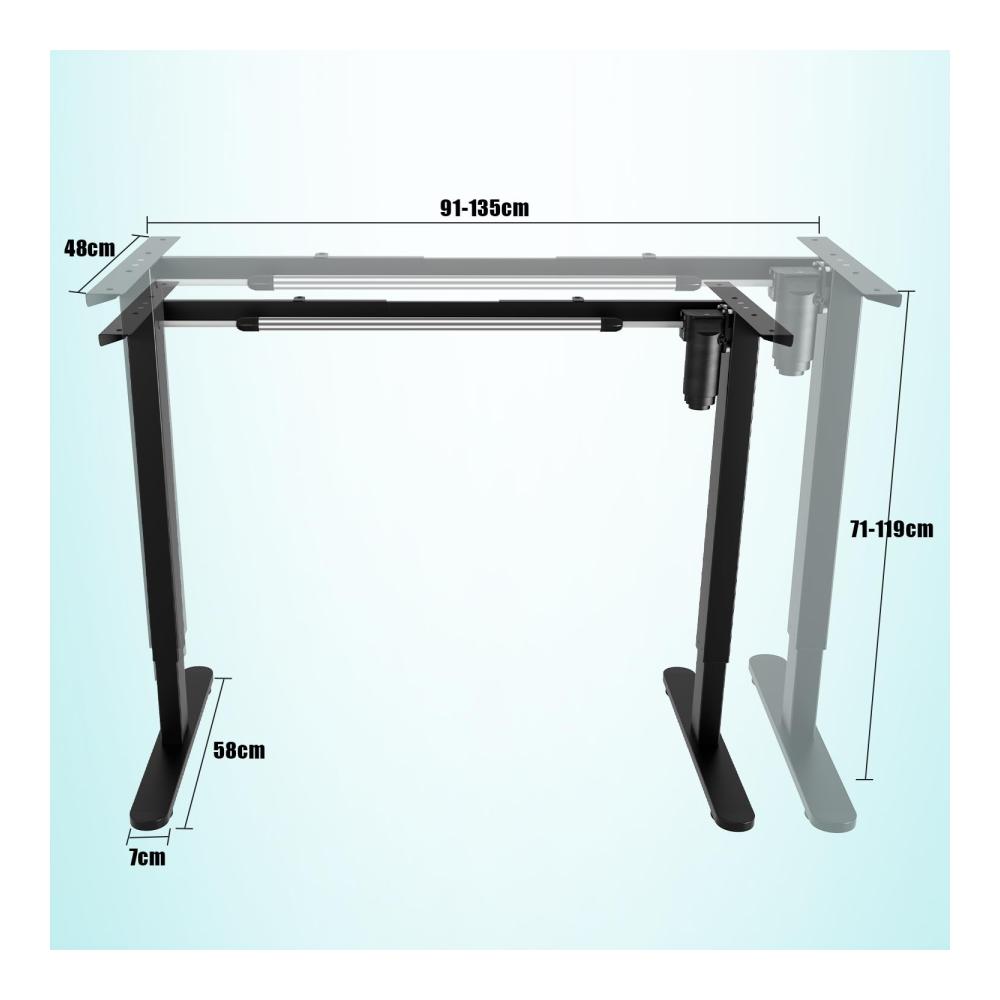 Die Speicherfunktion ermöglicht das einfache Abrufen von 4 verschiedenen Höheneinstellungen, während die Höhenverstellbarkeit von 71 cm auf 119 cm und die Breite von 91 cm auf 135 cm an Ihre Bedürfnisse anpassbar ist. Der Schreibtisch ist kompatibel mit Tischlängen von 120-160 cm und Breiten von 60-80 cm.